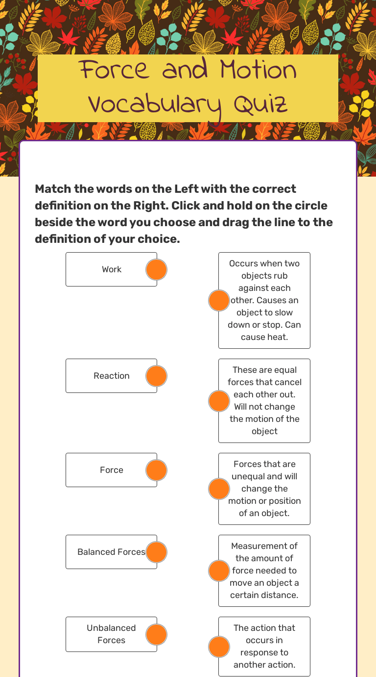 This worksheet tests your child's knowledge about vocabulary relating to energy, force, and motion. Twinkl » usa » fourth grade » . Please look at the second as an example. You may utilize the online textbook or a dictionary for the following vocabulary words. We add activities and exercises regularly on various themes, so why not bookmark our site, so you can come back to practice anywhere or at any time of the day. Distribute a printable set of vocabulary words related to force and motion. Causes something to move or change direction or speed. Forces are described by how strong they. A printable force and motion vocabulary worksheet containing 10 questions and answers to match. Post this force and motion anchor chart in your classroom when learning force and motion . The rate at which an object changes speed or direction. Teaching resources, printables, worksheets and more | teachersherpa. Answer key is also included.
